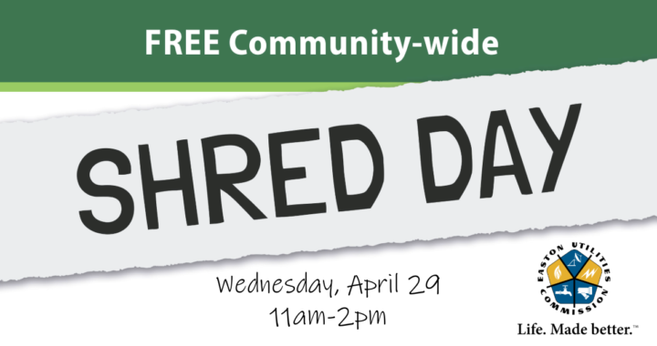 Join us for a FREE Community-wide Shred Day at the Easton Utilities Warehouse. Protect your identity, help the environment!